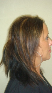 This client is wearing MPA Cyberhair accents 18 inch Synthetic hair extensions that you can curl ,flat iron blow dry and it loves water. Its twice as light and four times as strong as human hair and the color never never fades!!! More info @ www.advancedhairreplacement.com